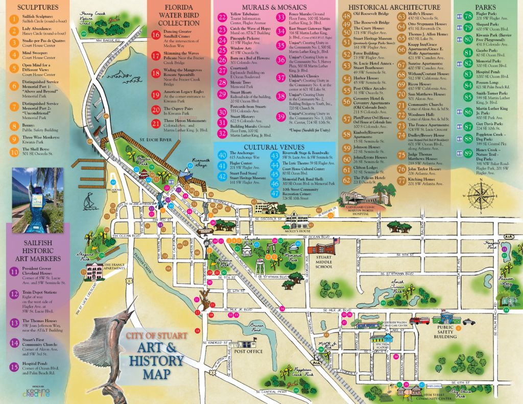 Stuart is rich in art and history, the City of Stuart has created an Art & History Map that contains a map of 89 sites within the City. You can print this map off prior to your visit or stop off at 101 SW Flagler Ave. at the Welcome Center when you are in town.